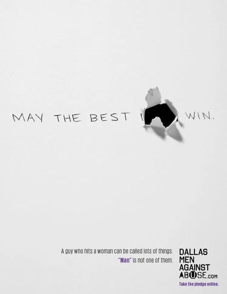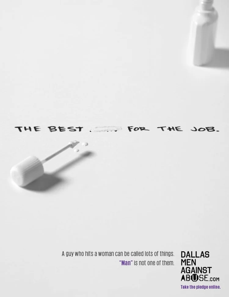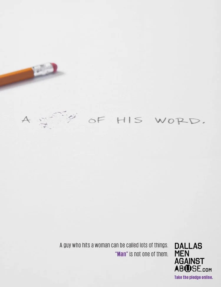 Dallas Men Against AbuseYou can call a guy who hits women a lot of things, but you cannot call him a man. “Be A Man” Bacon Salt BMW Cellular one CompUSA Dallas Men Against Abuse Dallas Morning News First NBC Bank Geico Icehouse Beer JCPenny McDonald's NHL Sierra Club Tabasco Texas Health TexasLending.com Visionworks Western Union