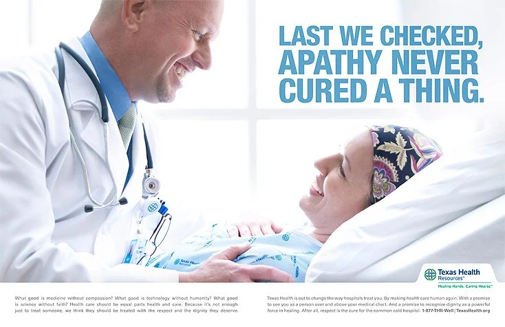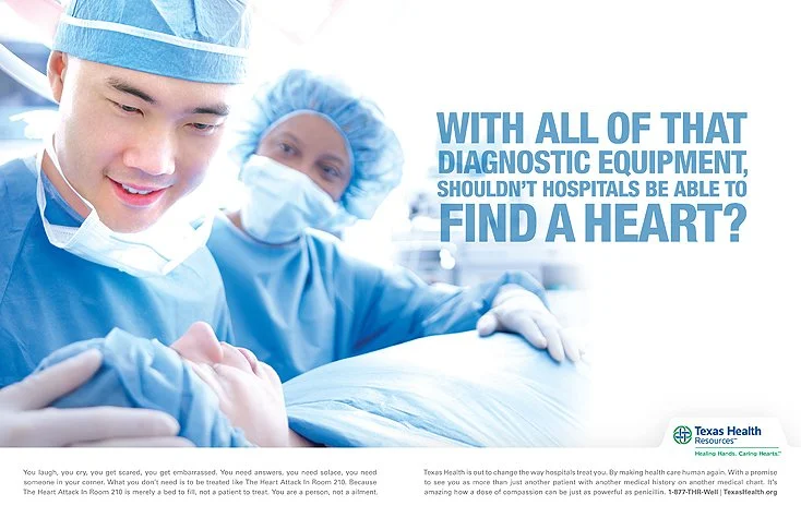 Texas HealthIt was time to bring humanity back to health care. “Comparing Scars” “I Don’t Know” Bacon Salt BMW Cellular one CompUSA Dallas Men Against Abuse Dallas Morning News First NBC Bank Geico Icehouse Beer JCPenny McDonald's NHL Sierra Club Tabasco Texas Health TexasLending.com Visionworks Western Union